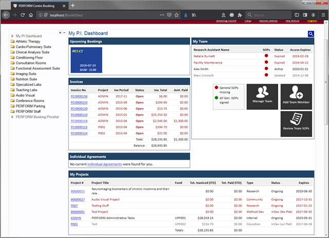 Additionally, when a P.I. is logged in, the homepage will show a dashboard view with snapshot reports showing things like upcoming bookings, recent invoices, team members, etc.