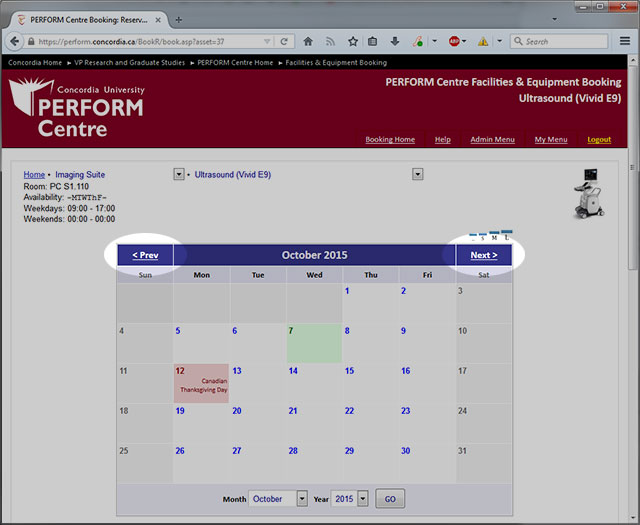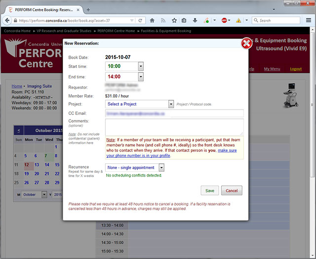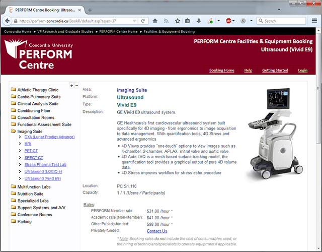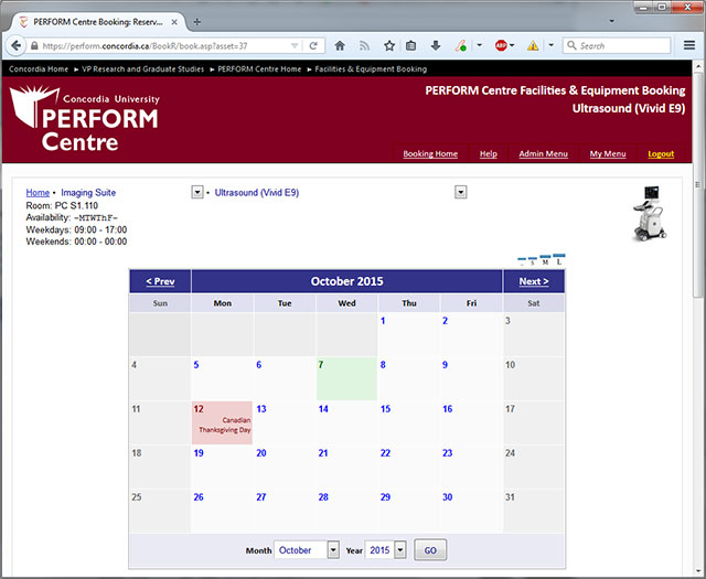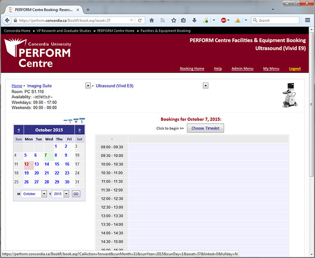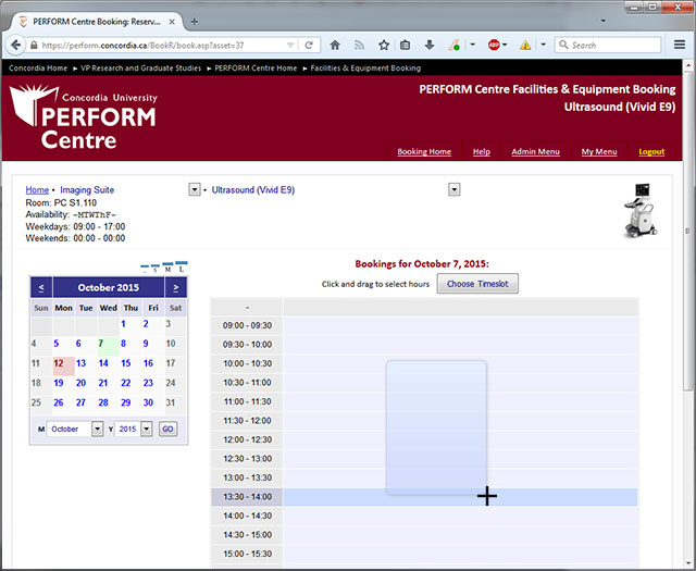 Showing end users (researchers) how to reserve equipment time on the School of Health's online booking system for Facilities & Equipment.