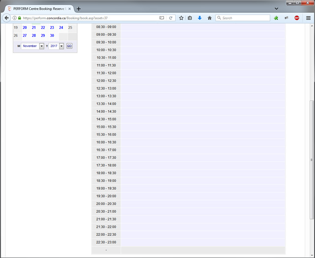 The hourly schedule will only display times that the selected platform is available for (ie. If an instrument can only be booked from 9am-5pm, then those are the only hours shown).