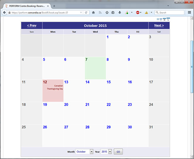 The calendar will indicate by colour which is the selected date for a booking (green), today's date (blue - unless if 'today' is the selected date, then it's green), and holidays where the university is closed (red). Holidays cannot be booked.