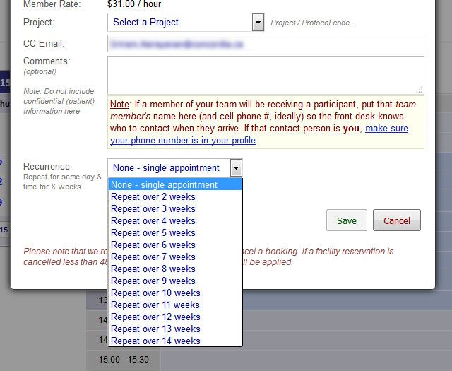 You can also select whether or not the reservation is a one-time-only booking, or a recurring booking that will repeat in the same day-of-week & time-slot for up to fourteen (14) weeks (ie. each Monday from 10:00-12:00 for three weeks).**