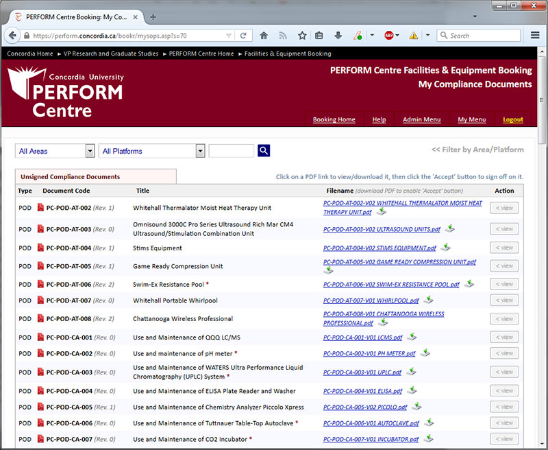 The list of unsigned documents can be filtered using the drop-down lists near the top of the page which lets you select by Area and individual Platform.