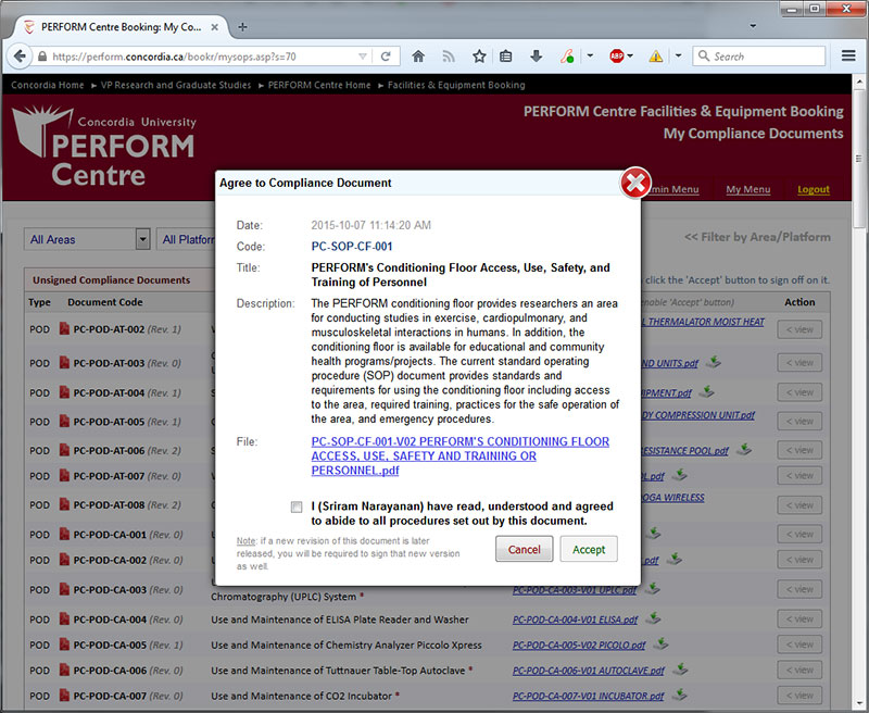 Click “Accept” to open the signing form where you confirm that you have read and agreed to the procedures set out in that document & accept it. Once completed, it will be added to the 'Signed Compliance Document' section and removed from the 'Unsigned' section.