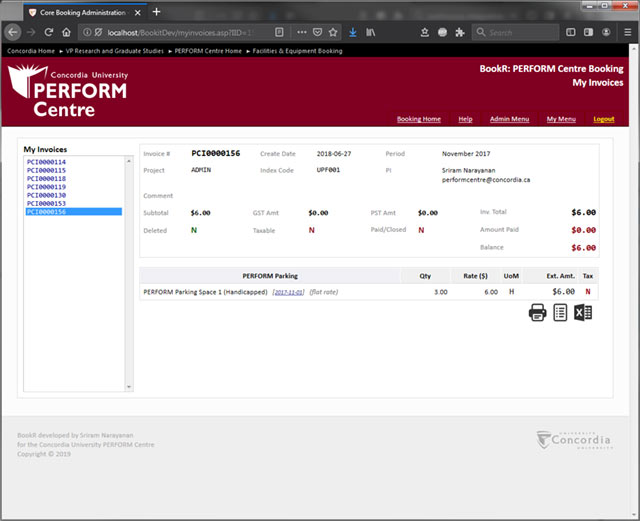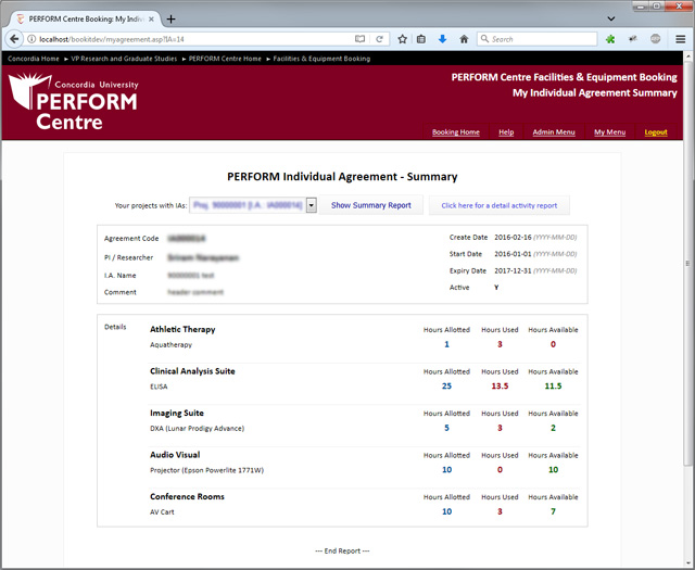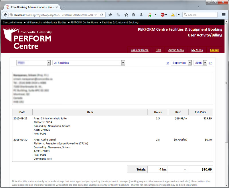 Allows you to view a monthly statement of your Booking activity. The report requires that you select a code that your activity is assigned to (ie. Project code, Grant code, Orgn code) - some researchers may have several - and generates a listing of all bookings linked to that code. It also allows you to filter by a specific facility.