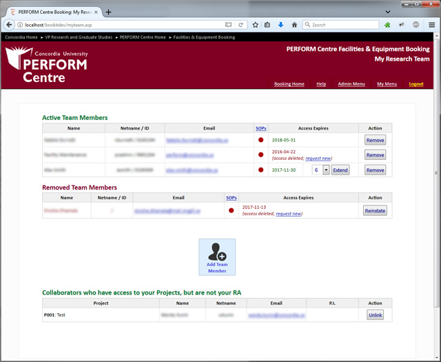 Allows you to revoke - and add back - Booking access to members of your team (ie. people who are linked to you as their PI). Removing a team member immediately locks their Booking login account so that they can't access the system, and notifies the SOH Operations Team by email so that they can remove (or restore - as required) physical access permissions and computer accounts as well.